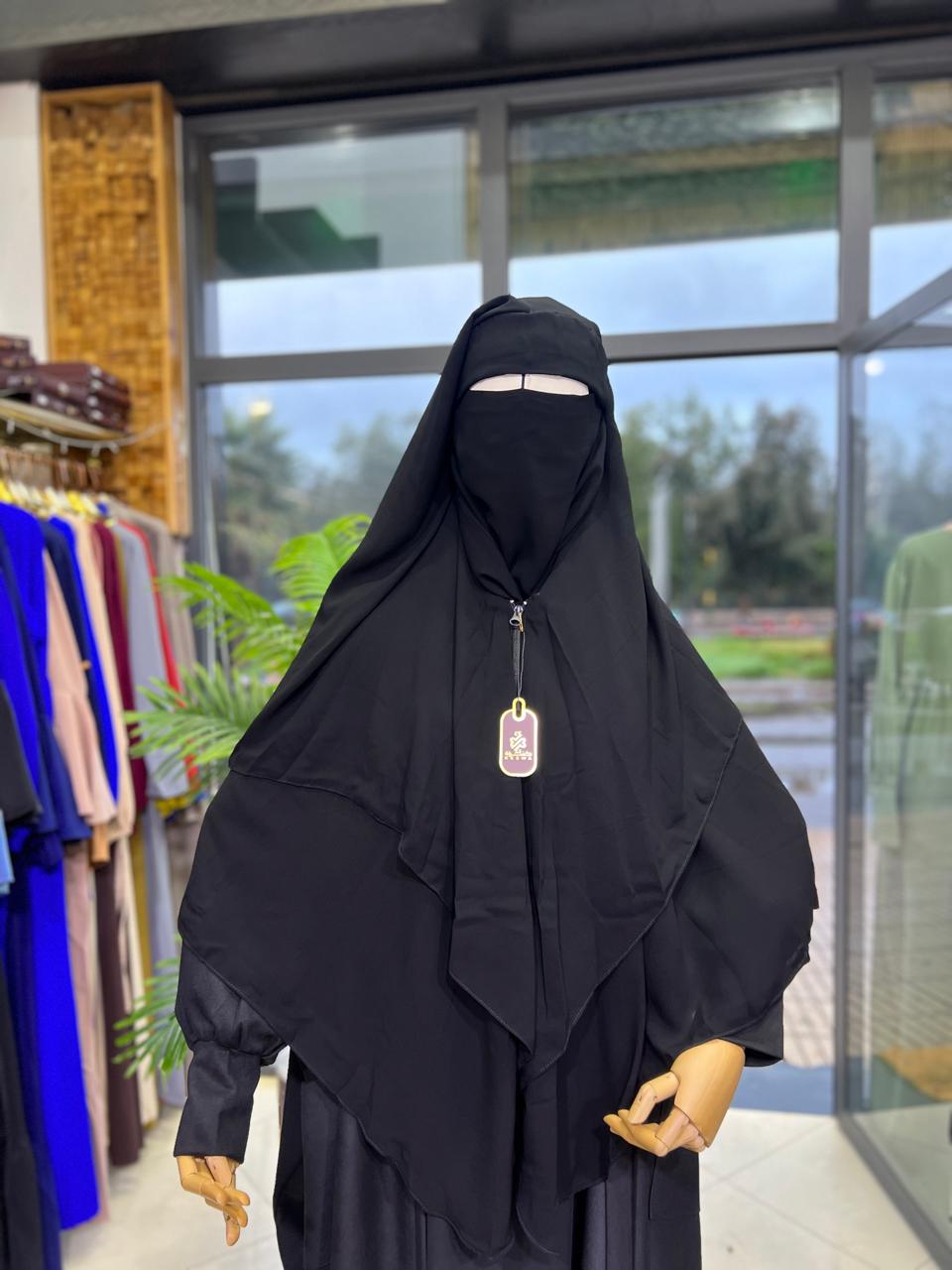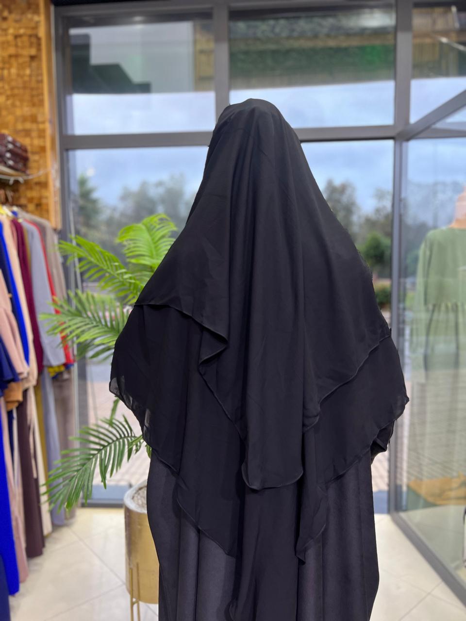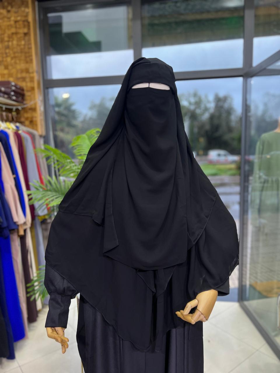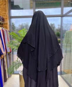 Niqab triangulaire noir profond, tissu doux et respirant pour un confort quotidien.
